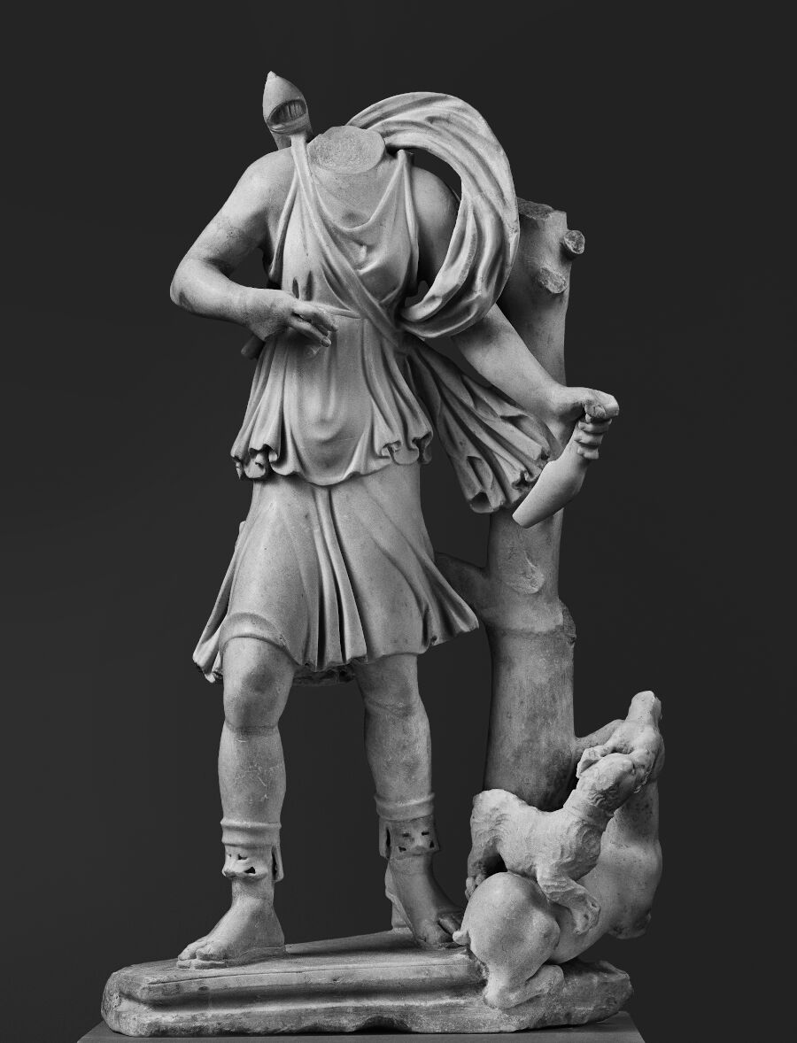 série de statues de moyen format, conservées à Dresde (Elle procède du type « Rospigliosi-Latran » L.I.M.C., Lexicon Iconographicum Mythologiae Classicae. V. 1, Herakles - Kenchrias, Zürich ; Munich, 1990, II, 1, 646, 251 - 283.), dont les torses très affinés, s’opposant à des membres inférieurs massifs, confinent à l’étrange et permettent d’abonder dans le sens d’une corporalité plus graphique que réaliste M. Bergmann, Chiragan, Aphrodisias, Konstantinopel : zur mythologischen Skulptur der Spätantike (Palilia), Wiesbaden, 1999, pl. 56-57.. Certains autres éléments trahissent cette esthétique, notamment la boucle en forme de S sur le front, les transitions un peu abruptes des plans de taille au niveau du visage, les arcades sourcilières formant un angle aigu, les sillons profonds créant une division synthétique des mèches ondulées. Ces caractéristiques permettent de relier entre elles une série d’œuvres, dont la datation tardive a été pertinemment justifiée par Marianne Bergmann : Hygie de Rhodes M. Bergmann, Chiragan, Aphrodisias, Konstantinopel : zur mythologischen Skulptur der Spätantike (Palilia), Wiesbaden, 1999, 51, pl. 49-1., têtes féminines de Dijon M. Bergmann, Chiragan, Aphrodisias, Konstantinopel : zur mythologischen Skulptur der Spätantike (Palilia), Wiesbaden, 1999, p. 45, p. 47, pl. 55-2, 56-2. et Chiragan M. Bergmann, Chiragan, Aphrodisias, Konstantinopel : zur mythologischen Skulptur der Spätantike (Palilia), Wiesbaden, 1999, p. 54, pl. 55-3.4, 56-3., d’Apollon à Saint-Georges-de-Montagne M. Bergmann, Chiragan, Aphrodisias, Konstantinopel : zur mythologischen Skulptur der Spätantike (Palilia), Wiesbaden, 1999, p. 54, pl. 55-1, 56-4. ou encore un grand portrait féminin des musées du Capitole M. Bergmann, Chiragan, Aphrodisias, Konstantinopel : zur mythologischen Skulptur der Spätantike (Palilia), Wiesbaden, 1999, 61-63 ; K.T. Erim, Aphrodisias : City of Venus Aphrodite, London, 1986 ; M. Floriani Squarciapino, La Scuola di Afrodisia : Studi e materiali del Museo dell’Impero romano. 3, Rome, 1943..