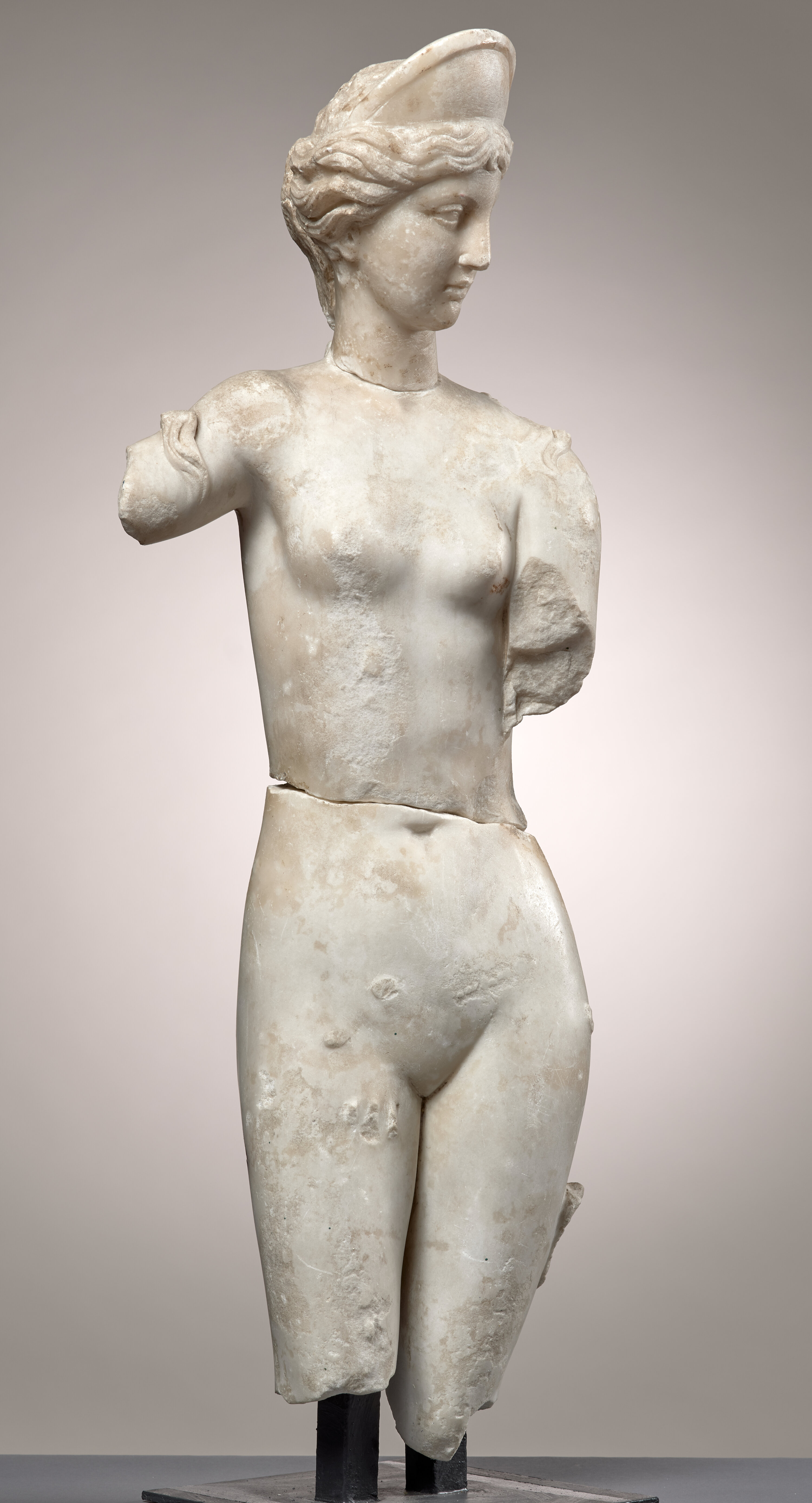 Couronnée d’un diadème, la figure se distingue par une minceur et des proportions inhabituelles qui attirent immédiatement l’attention. L’élongation de ses formes, associée à la platitude de son fessier comme de son torse, rendent assurément l’œuvre singulière. Lorsque les deux fragments qui la composent furent découverts, en 1890, la villa de Chiragan connaissait sa troisième grande campagne officielle de fouilles, dirigée par Albert Lebègue, professeur à la Faculté des lettres de Toulouse G. Perrot, « Rapport sur les fouilles de Martres », Revue Archéologique, 18, 1891, p. 56‑73, en partic. p. 415.. Le bris se situait au-dessus de la région ombilicale. Les deux parties furent réunies par un collage. La main droite, tenant une mèche de cheveu, aurait été simultanément mise au jour É. Espérandieu, Recueil général des bas-reliefs de la Gaule romaine, 2. Aquitaine, Paris, 1908, no 903.. La tête, probablement découverte durant la première moitié du siècle et déjà conservée dans les collections du musée de Toulouse, ne fut mise en rapport avec le corps qu’en 1948, par Paul Mesplé P. Mesplé, « Raccords de marbres antiques », La Revue des Musées de France, July, 1948, en partic. p. 156.. Émile Espérandieu attribua erronément sa découverte aux fouilles de 1897-1899, menées par Léon Joulin É. Espérandieu, Recueil général des bas-reliefs de la Gaule romaine, 2. Aquitaine, Paris, 1908, no 905.. Peut-être était-il fait mention de cette tête dans le premier feuillet, malheureusement disparu, du cahier manuscrit correspondant aux découvertes des 19 et 20 septembre 1826 J.-C. Balty, D. Cazes, Les portraits romains, 1 : Époque julio-claudienne, 1.1 (Sculptures antiques de Chiragan (Martres-Tolosane), Toulouse, 2005, p. 35..