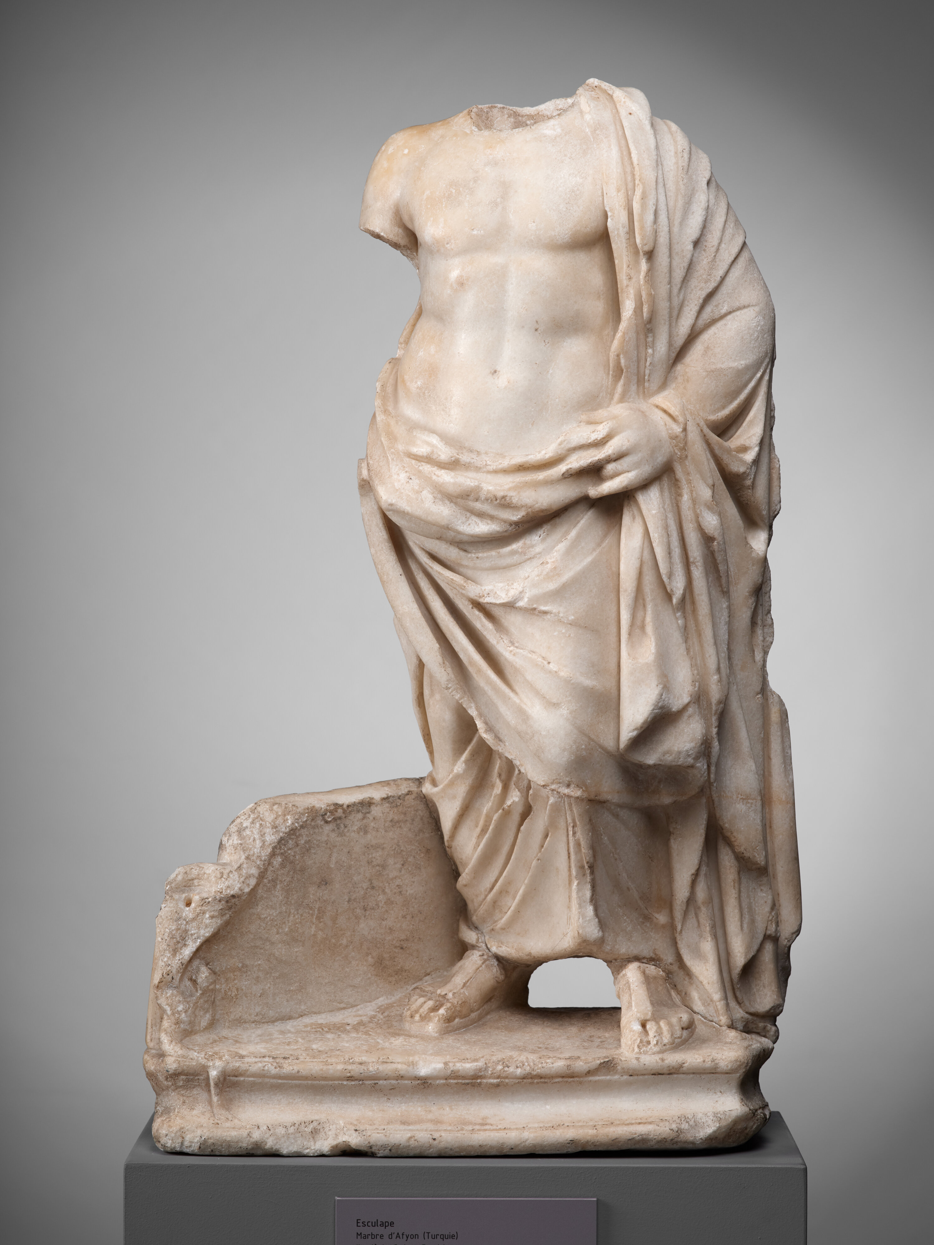 Esculape (l’Asclépios grec), dieu de la médecine, fut confié, très jeune, par son père, Apollon, au centaure Chiron qui lui apprit l’art de la guérison. La discipline est symbolisée, entre autres, par le serpent, dont on aperçoit encore la queue, sur la base, à gauche, qui s’enroulait autour du bâton noueux que tenait la divinité d’Épidaure.