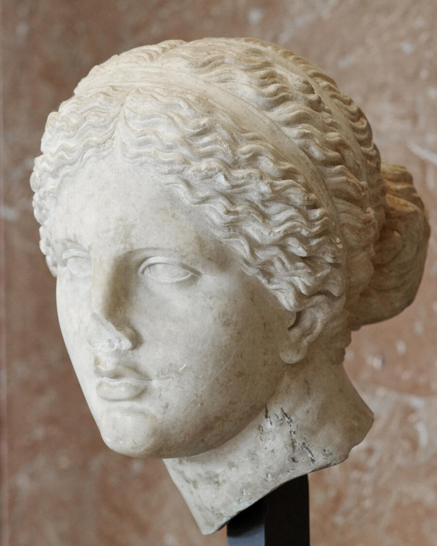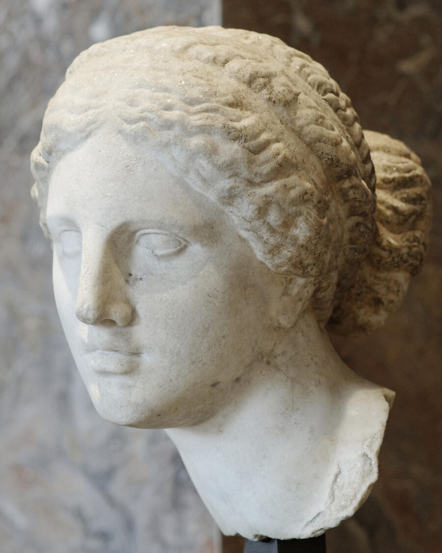 Une part du mystère de ce visage, de ce corps et de cette attitude imprègne encore les plus belles répliques parvenues jusqu’à nous. La tête de Martres, projetée vers l’avant, vient nous rappeler la douce inclinaison de la Vénus cnidienne. Son haut chignon dégage la gracieuse ligne arrière d’un cou que poursuivait la rondeur du dos. De longues mèches ondulées sont divisées par une raie médiane et maintenues par une double bandelette lisse qui entoure le crâne. Cette bandelette fait-elle allusion au kestos himas (« ceinture enroulée »), brodé, d’Aphrodite ? Ce cestus veneris rendait la déesse irrésistible et objet de l’amour de quiconque s’en approchait. Les traits du visage sont réguliers hormis la légère dissymétrie des yeux. Mais au contraire de la froideur de certaines répliques, à l’exemple de la