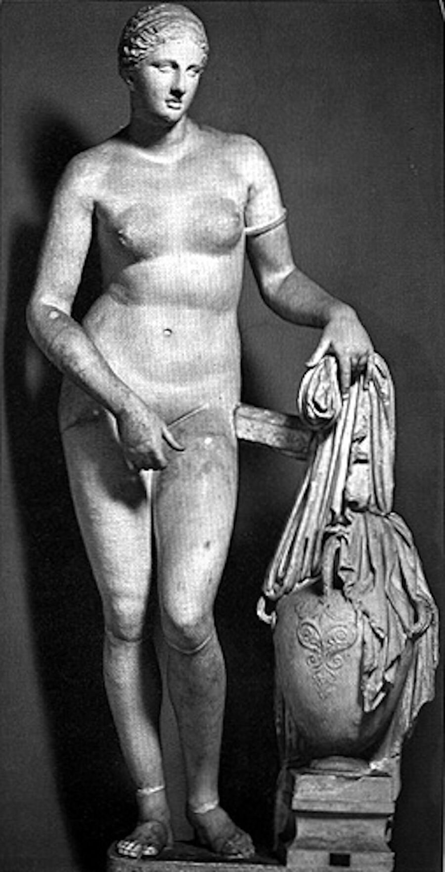 On sait que le corps nu de la déesse avait surpris, sinon choqué, dans un premier temps, à tel point que les gens de Cos, voisins et rivaux de ceux de Cnide, refusèrent la statue, dont ils avaient passé commande pour leur temple. Ils la cédèrent aux Cnidiens, peut-être plus audacieux, mais qui, surtout, semblent l’avoir substituée à une effigie cultuelle déjà nue, de tradition orientale, où dominait le concept de fécondité. Du reste, ce corps pétrifié était d’autant moins caché qu’il fut installé dans une chapelle largement ouverte, petit temple circulaire élevé dans une enceinte sacrée plantée de myrtes, de cyprès, de platanes et de vigne. De son bras droit, Aphrodite ramenait sa main en direction de son pubis, un geste qui fut interprété de pudeur, tel un être surpris dans son intimité, mais qui permettait, à la déesse de la fécondité, de désigner l’appareil génital reproducteur. La main gauche maintenait quant à elle une étoffe, au-dessus d’une hydrie en bronze. La présence de ce récipient indique sans ambiguïté la toilette d’Aphrodite, dont le buste, légèrement penché, se reflétait peut-être dans une vasque. La composition, qui dépassait une simple scène de genre montrant Aphrodite surprise au bain, renvoyait probablement au caractère rituel des ablutions.